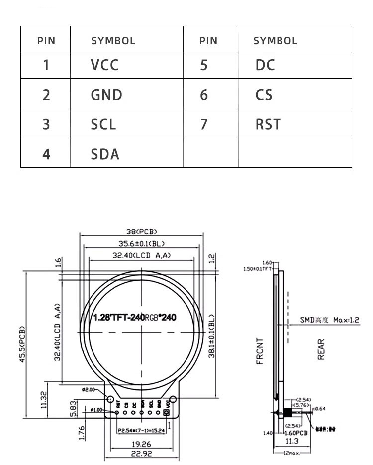 1.28inch IPS TFT LCD Display Module 240*240 Resolution 4 Line SPI Interface GC9A01 Small LCD Module
