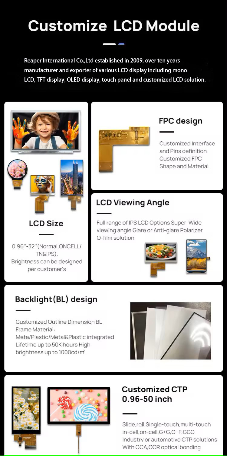 Reaper standard TFT-LCD display modules are available in various sizes from 1.77" to 10.4' TFT LCD, such as 2.4" TFT display, 2.8", 3.5" TFT display, 4.3" TFT display, 5 inch display, 7" LCD display. These TFT LCD modules are including options of TFT panel, TFT LCM with controller board, industry standard mono TFT LCM, TFT color display, and wide operating temperatures of -20°C to +70°C or -30°C to +80°C.
