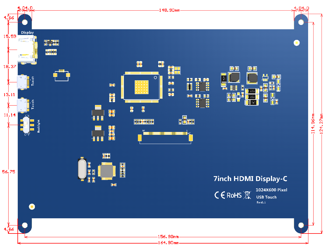 - 7’’ standard display, 1024 × 600 Hardware resolution, Up to 1920x1080 Software configuration resolution.